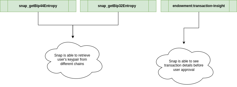 snap_getBip44Entropyandsnap_getBip32Entropy-> a malicious snap retrieving keypair leads to loss of fundsendowment:transaction-insight-> a malicious snap getting insights of a transaction before approval can lead to frontrunning attacks